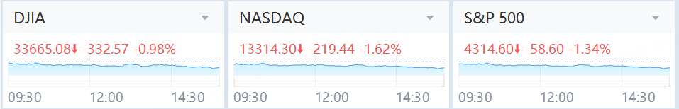 The Dow Jones Industrial Average fell 332.57 points, or 0.98%, to 33,665.08, the S&P 500 fell 58.60 points, or 1.34%, to 4,314.60 and the Nasdaq Composite fell 219.44 points, or 1.62%, to 13,314.30.