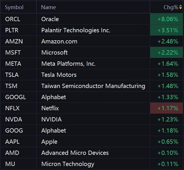 Oracle rose 8%; Palantir rose 4%; Amazon rose 3%; Meta, Tesla, and TSMC rose 2%; Alphabet and Nvidia rose 1%.