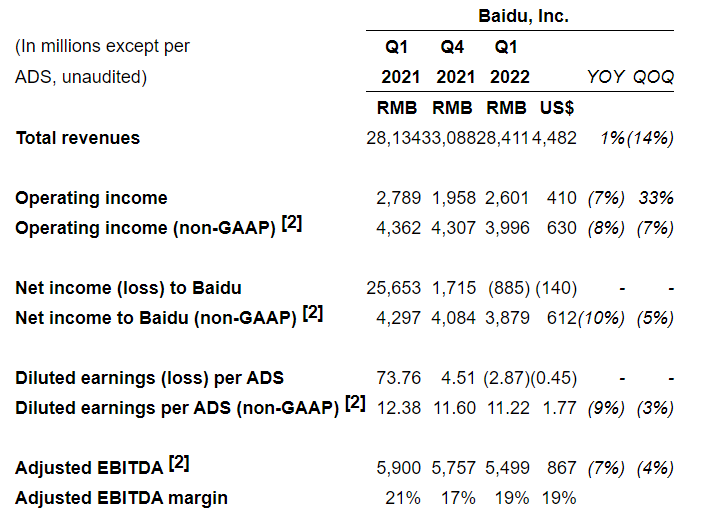 Baidu, Inc.(NASDAQ: BIDU and HKEX: 9888) , a leading AI company with strong Internet foundation, today announced its unaudited financial results for the first quarter endedMarch 31, 2022.