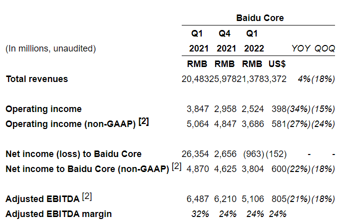 - Revenue from Managed Page grew by 31% and reached 47% of Baidu Core's online marketing revenue in the first quarter of 2022.