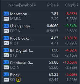 Crypto stocks continued to fall in premarket trading, with Marathon sliding over 5% and Riot Blockchain sliding over 3%.