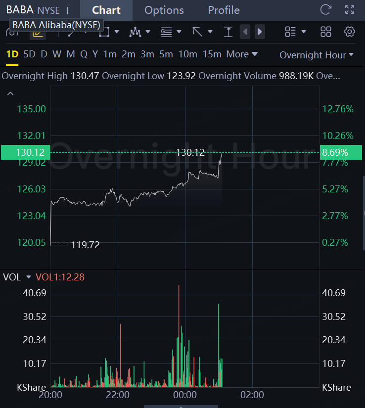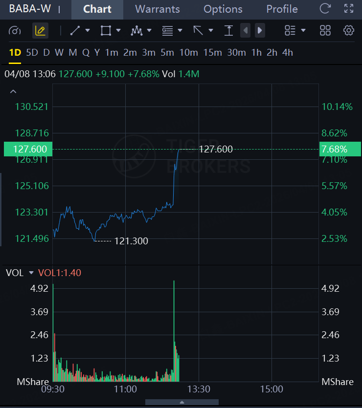 Alibaba's H-shares experienced a sharp surge in the afternoon, rising more than 7%, while its U.S.-listed shares climbed over 8% during the overnight trading session.