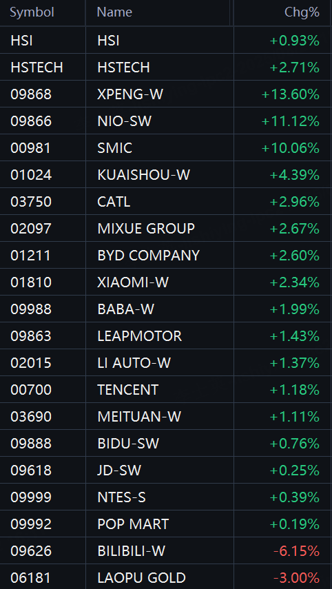 In terms of star stocks, XPeng rose 14%; NIO rose 11%; SMIC rose 10%; Kuaishou rose 4%; CATL, Mixue Group, and BYD rose 3%; Xiaomi and Alibaba rose 2%; Li Auto, Tencent, and Meituan rose 1%; while Bilibili fell 6%; Laopu Gold fell 3%.