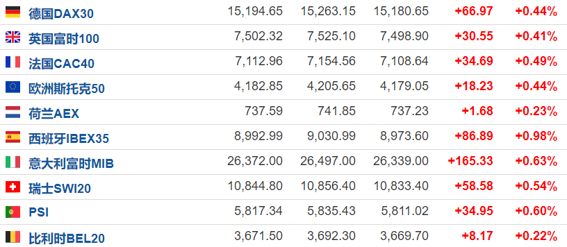 欧洲主要指数集体上涨,德国DAX30涨0.44%,英国富时100涨0.41%,法国CAC40涨0.49%。原油