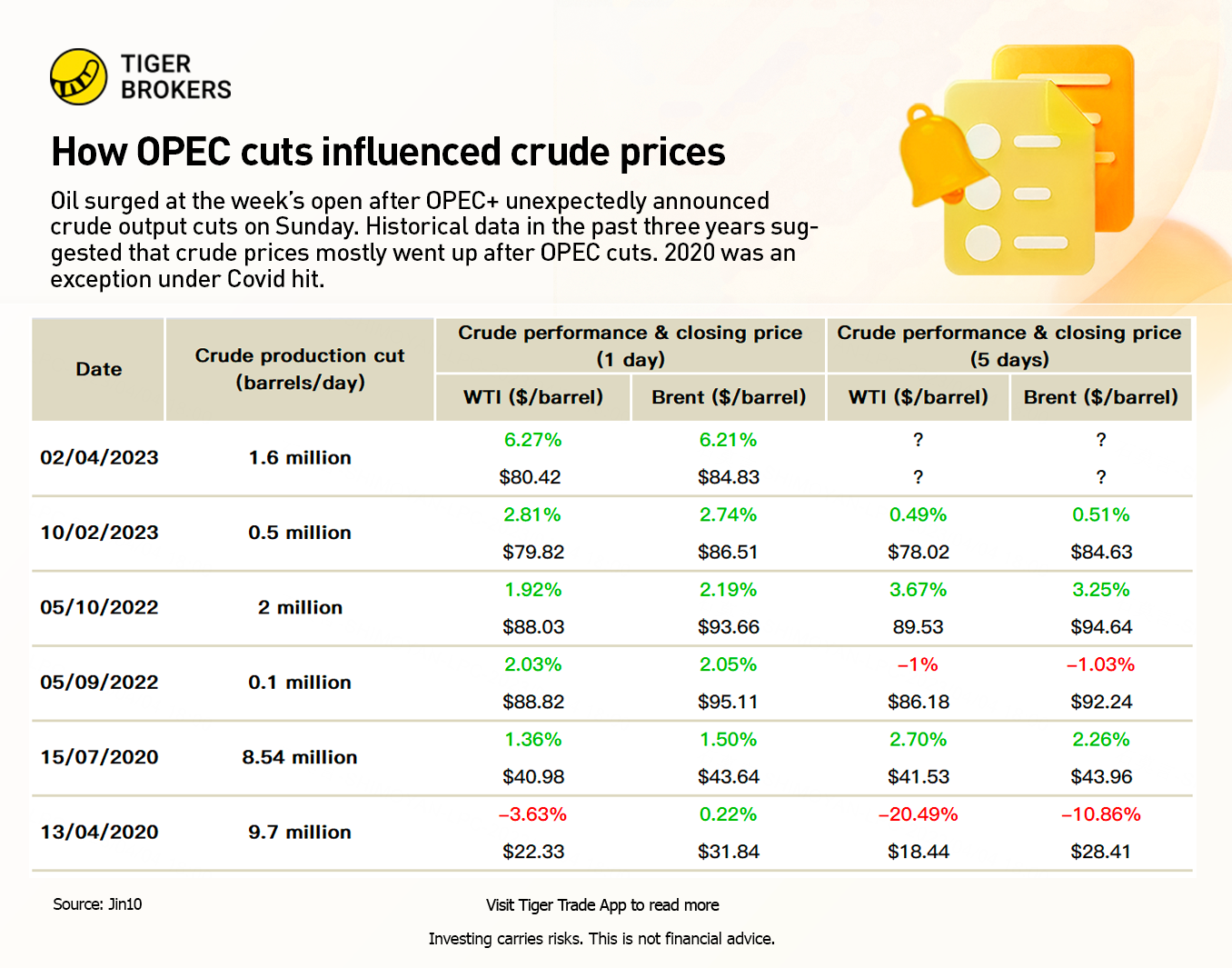 Oil surged at the week’s open after OPEC+ unexpectedly announced crude output cuts on Sunday, with Saudi Arabia leading the way with 500,000 barrels a day of reductions from May.