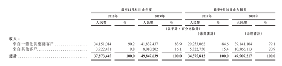 招股书显示,2018年、2019年、2020年前9个月,京东物流来自一体化供应链客户的收入分别为341.5亿、418.37亿和391.41亿元,占总收入的比重分别为90.2%,83.9%和79.1%。一体化供应链客户数量则从2018年底的32465家增长至2020年9月30日的46083家,增长42%。