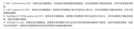 以京东POP平台业务为例,京东物流主要提供四种类型的仓配服务:SOP、FBP、LBP 以及Sopl,根据不同的仓配服务收取不同的费用。