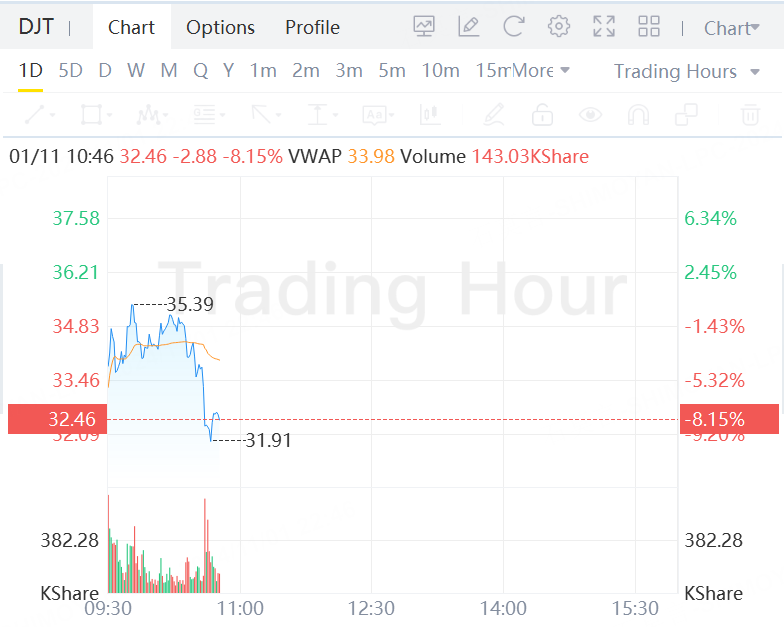 The stock, DJT, was down 12% to $35.34 at Thursday's close. DJT dropped 22% on Wednesday, its biggest decline since April, but it has still roughly doubled this month.