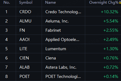Optics Tech Companies Rise in Overnight Trading. Credo Technology up 10%; Aeluma up 6%; Fabrinet and AAOI up 2%; Lumentum up 1%.