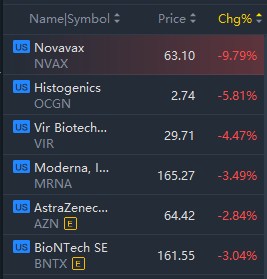Vaccine stocks crashed in morning trading, with Novavax falling nearly 10% and Ocugen falling over 5%.
