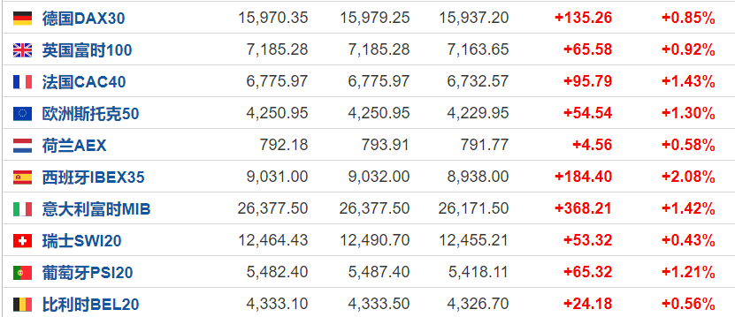 欧洲主要指数集体上涨,欧洲斯托克50指数涨1.30%,英国富时100指数涨0.92%,德国DAX30指数涨0.85%。来源:英为财情Investing.com