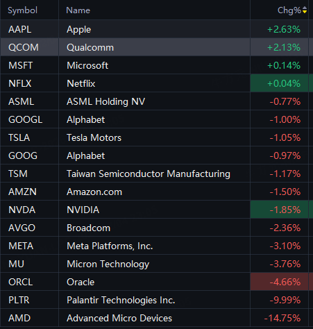 Big tech stocks mixed in Wednesday trading. Apple up 3%; Qualcomm up 2%; AMD down 15%; Palantir down 10%; Oracle down 5%; Micron down 4%; Meta down 3%; Nvidia, Amazon down 2%; Tesla down 1%.
