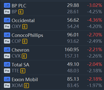 Oil stocks dropped in premarket trading as Brent crude and WTI futures both fell more than 4%.
