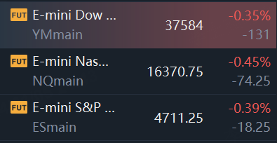 At 8:44 a.m. ET, Dow e-minis were down 131 points, or 0.35%, S&P 500 e-minis were down 18.25 points, or 0.39%, and Nasdaq 100 e-minis were down 74.25 points, or 0.45%.
