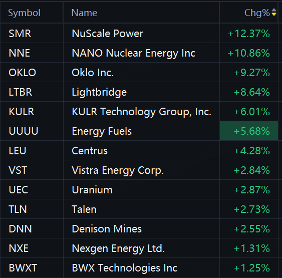 Nuclear energy stocks jumped in morning trading. NuScale Power rose 12%; NANO Nuclear Energy rose 11%; Oklo and Lightbridge rose 9%; KULR Technology and Energy Fuels rose 6%; Centrus rose 4%; Vistra Energy, Uranium, Talen, and Denison Mines rose 3%.