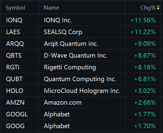Quantum computing stocks rallied in morning trading. IonQ rose 12%; Sealsq rose 11%; Arqit Quantum and D-Wave Quantum rose 9%; Rigetti Computing rose 8%; Quantum Computing rose 7%.