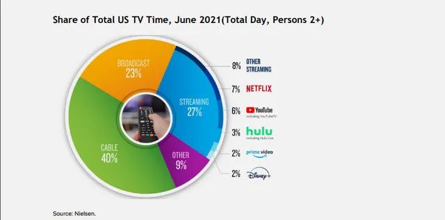 对于任何以内容为核心的互联网公司而言,用户的屏幕时间是业务成功的关键。在股东信中,Netflix表示,尼尔森的数据显示,流媒体播放仅占美国电视屏幕播放时间的27%,而有线电视和广播则占到了63%。基于同样的研究,尼尔森估计Netflix只占美国电视屏幕时间的7%。考虑到Netflix其他国家还不太成熟,这一数据只会更低。