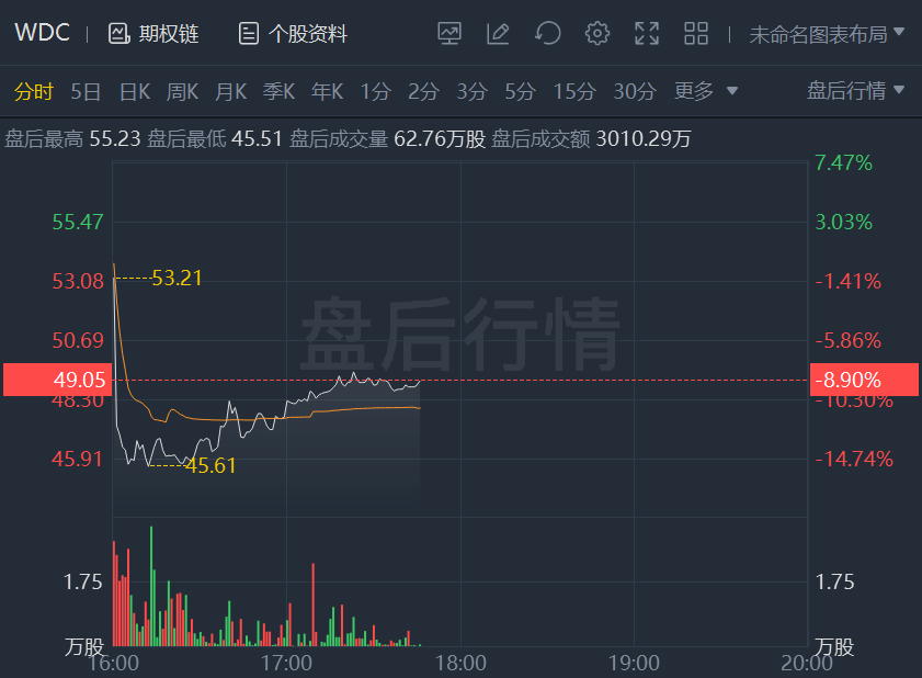 Western Digital shares dropped nearly 9% after hours, following a 1.4% decline in the regular session to close at $53.84.