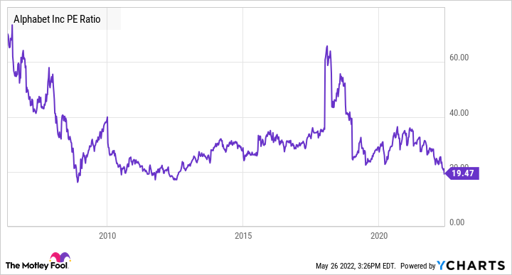 Of note, Alphabet's price-to-earnings ratio, based on trailing-12-month earnings, has fallen all the way to 19.4. That's a level not seen since the financial crisis of 2008-2009 and its subsequent European aftershocks in 2011-2012: