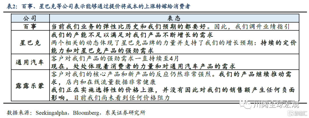 二是供需错配的持续。供应链扰动下,导致通胀高涨的产能限制仍存在,俄乌冲突、中国疫情反复下美国工业生产所需的原材料和中间品供给不足。而需求仍然强劲,这也体现在微观的公司层面,百事、星巴克等公司表示能够通过提价将成本的上涨转嫁给消费者,因而在销售收入增加的同时,利润率并未受到稀释,部分公司还因此调升了业绩预期(表2)。