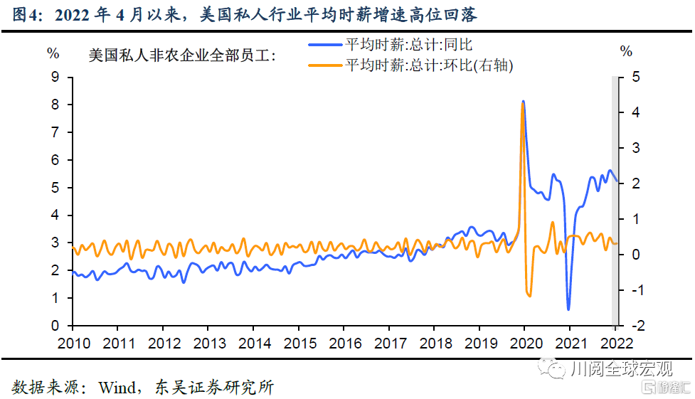 不过薪资上涨动能放缓,释放部分积极信号。一方面,2022年4月以来美国薪资增速持续回落,私人行业平均时薪同比增速已从3月的5.6%降至5月的5.2%(图4)。另一方面,美国公司通过提高工资来吸引求职者的倾向降低。