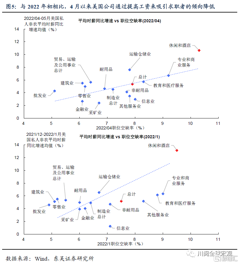 对比今年4月和1月的数据可以看出,尽管职位空缺率仍居高位,但与工资增速的相关性降低(图5)。