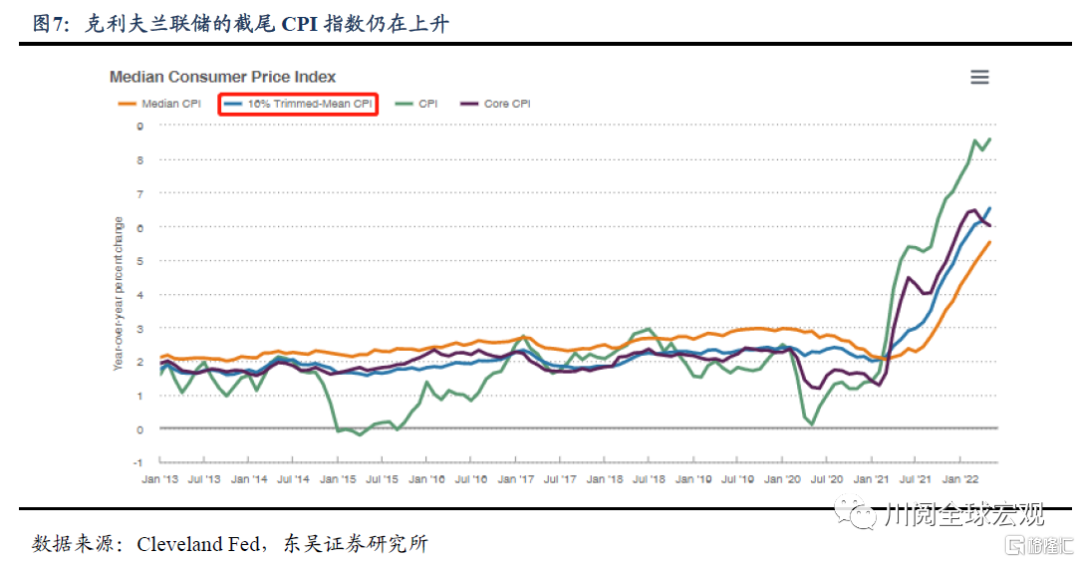如此看来,2022年年内美国核心CPI降至4%难度较大。除了核心CPI外,美联储官员还关注两类指标:一是在整体的通胀中剔除了异常波动项影响的截尾平均CPI,二是在整体通胀中剔除了反周期性影响的指标(亚特兰大联储的粘性价格CPI和旧金山联储的周期性核心PCE),而部分指标仍在上升(图7)。这意味着在将于6月15日至16日举行的议息会议上,美联储或再度上调通胀预测。