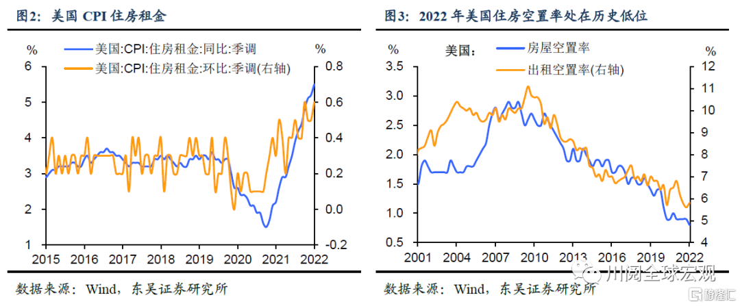 一是住房租金上涨动能增强。2022年5月住房租金环比增速升0.1%至0.6%,尽管加息使得美国房市略有降温,但尚未对需求产生足够的破坏,而住房供给仍旧偏紧,房屋空置率和出租空置率处在历史低位,供需不平衡的情况尚未有效缓解(图2-图3)。根据我们此前报告《2022年美国通胀如何见顶回落?》对历史数据的分析,标普美国房价指数约领先房租15个月,该指数于2021年8月见顶回落,由此推算住房租金增速的回落至少要等到2023年初。