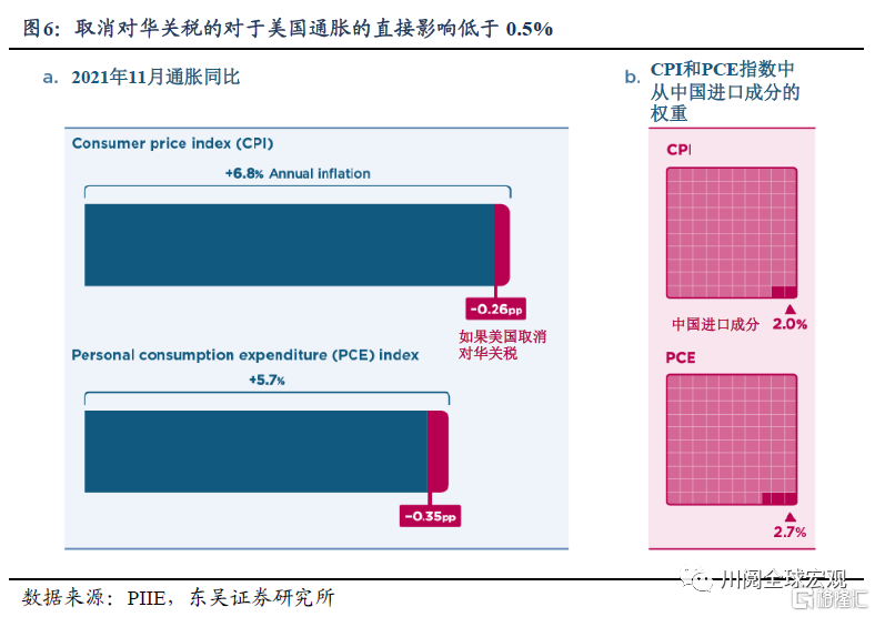 根据彼得森经济研究所的测算,如果只取消对华关税,直接影响仅会使得美国CPI降0.26%,PCE降0.35%(图6);极端假设下,若美国和中国取消贸易战关税,此外美国还取消对所有国家的钢铁和铝的关税以及对加拿大软木的关税,才能使得CPI下降1.3个百分点,但此假设在现实中难以被满足。