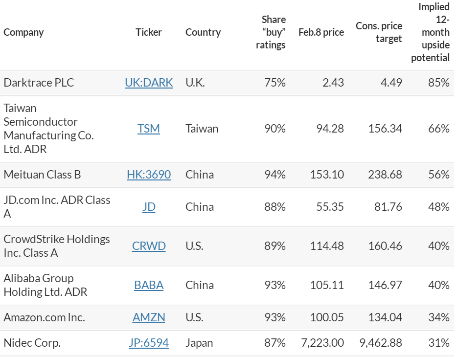 So we have narrowed the list further to the 20 stocks for which analysts see the most upside potential over the next 12 months, based on consensus price targets. Prices and targets are in local currencies, where the stocks are listed.