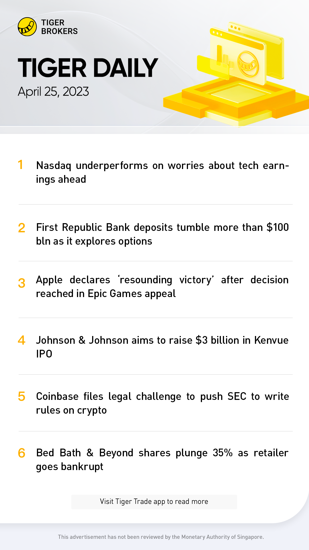 In the penny-stock department, shares in once-popular home goods retailer Bed Bath & Beyond tumbled 35.7% to 19 cents after it declared bankruptcy on Sunday. Retail rivals including Target Corp and Walmart Inc gained 1.1% and 0.7% respectively on Monday.