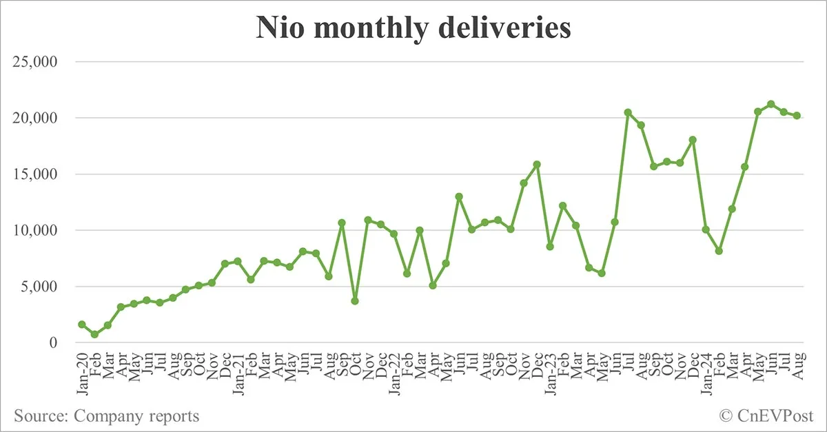 Nio delivered 20,176 vehicles in August, the fourth consecutive month above the 20,000 mark. That's up 4.38 percent year-on-year, though down 1.57 percent from July.