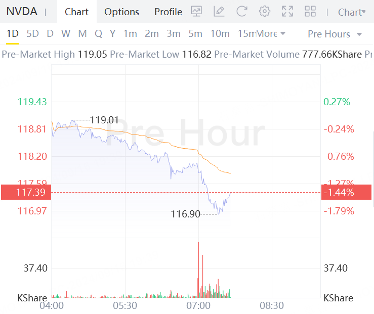 Nvidia shares were down 1.44% at $117.39 in premarket trading on Monday. The stock closed broadly flat on Friday but has risen 12% over the past five trading sessions.