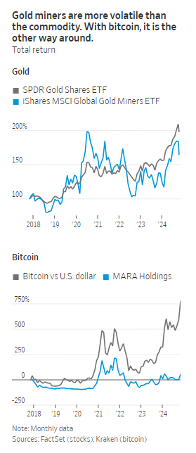Oddly, though, stock prices of gold miners rise higher than the metal in bull markets but tend to even out in the long run, whereas bitcoin miners are less volatile than the cryptocurrency. The CoinShares Valkyrie Bitcoin Miners ETF is up about 40% this year even though the value of bitcoin has doubled.