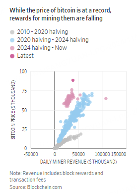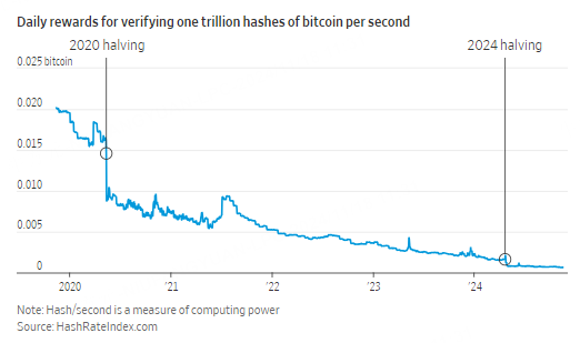 Mining gets more expensive by design: The value of these rewards relative to the computational power needed to obtain them has gone from 0.02 bitcoin per terahash/second a day to less than 0.001 bitcoin between the end of 2019 and now, according to HashRateIndex.com.