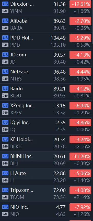 Alibaba’s U.S.-traded American depositary receipts fell 2.7% Tuesday, after jumping 7.4% Monday. E-commerce rival JD.com slumped 4.1% following its 11% surge in the previous session. It was a similar story for ADRs of Chinese electric-vehicle makers NIO, Li Auto, and XPeng—all three were between 5% and 8% lower.