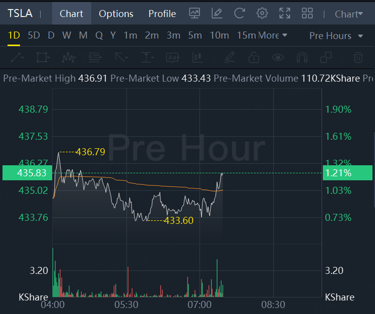 Tesla stock was up 1.2% to $435.83 in premarket trading. Shares rose 2.3% on Monday.