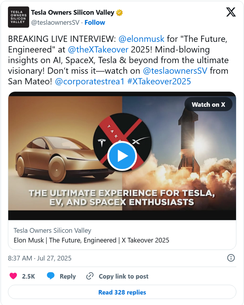 Musk made a virtual appearance at the Tesla Owners of Silicon Valley 2025 " Takeover" party in San Mateo, Calif. The group is, essentially, a fan club and community for Tesla and Musk enthusiasts. Its Takeover event draws attendees from all over the world, according to organizers.