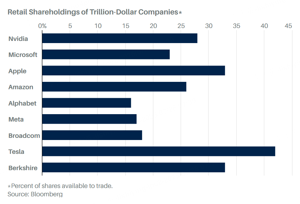 Investors should pay attention to events like the "Takeover." It's almost like a Wall Street event for the EV maker. Tesla is more of a retail stock than the megacap companies. Smaller retail investors hold more than 40% of the shares available for trading, according to Bloomberg. The average for the rest of the Magnificent Seven is closer to 25%.