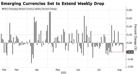 智通财经APP获悉,新兴市场股票和货币预计将遭遇约三周以来的最大跌幅,原因是美国科技巨头股票的抛售打击了对风险较高资产的需求。MSCI新兴市场货币指数下跌了多达 0.3%,而反映发展中经济体股票的指数则下跌了 1.3%。台币和韩元领跌,而台积电(TSM.US)则是股市跌幅最大的公司。
