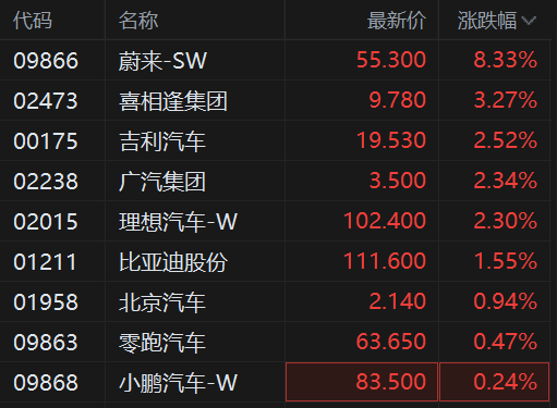 港股汽车股拉升,其中,蔚来涨超8%大幅领先,吉利汽车、广汽集团、理想汽车涨超2%,比亚迪股份涨1.55%,北京汽车、零跑汽车、小鹏汽车均有涨幅。