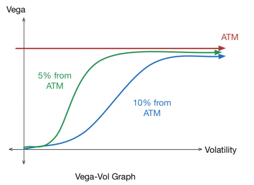 For a given volatility, the at-the-money option has the largest vega, and this sets a maximum limit on the vega of other options as per the red line in the above graph.