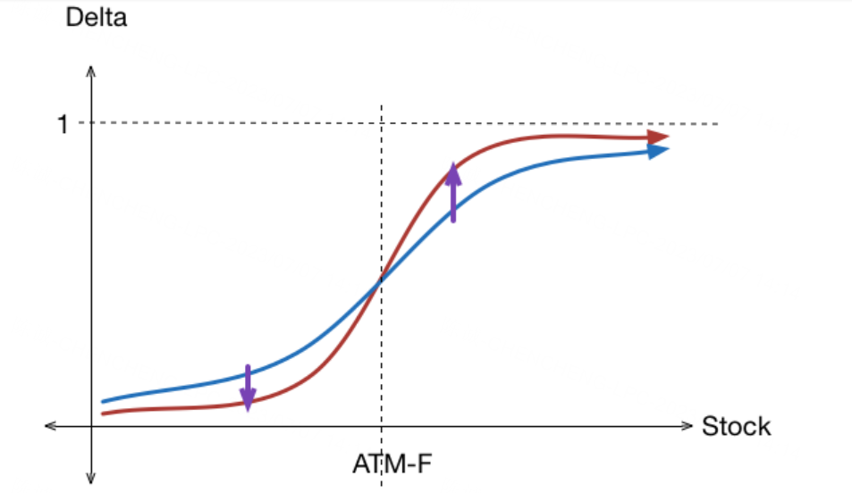 The following graph is the effect of a decrease in time or volatility on Delta. The blue curve represents an option with higher time value caused by either more time to expiry or higher volatility (or both), and the red curve represents an option with the same strike with less time value (time to expiry or volatility). As time passes, the Delta curve starts to approach zero (out-of the-money) or plus one (in-the-money)
