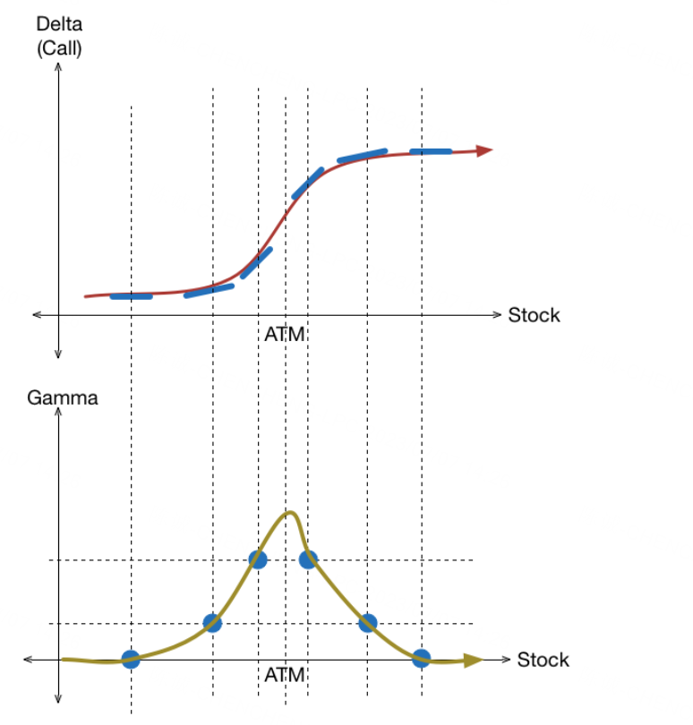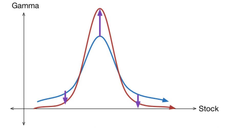 The best way to understand the graph of gamma, is to take the graph of delta and differentiate it point-wise. We take the delta graph (red), find the tangent at each point (blue line), whose slope gives us the value of gamma (blue circle), which we then connectup to get the gamma curve (yellow).