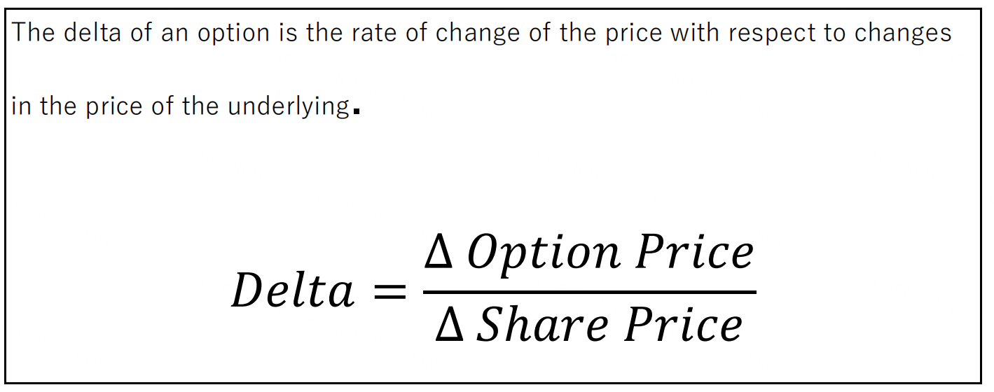 The Delta of an option measures the change in option premium for a $1 increase in share price (or underlying asset price). The delta is quoted as a proportion of the share price change, for example if the share price rises by 10 cents and the option price rises by 2 cents the delta is 0.20 or 20%.