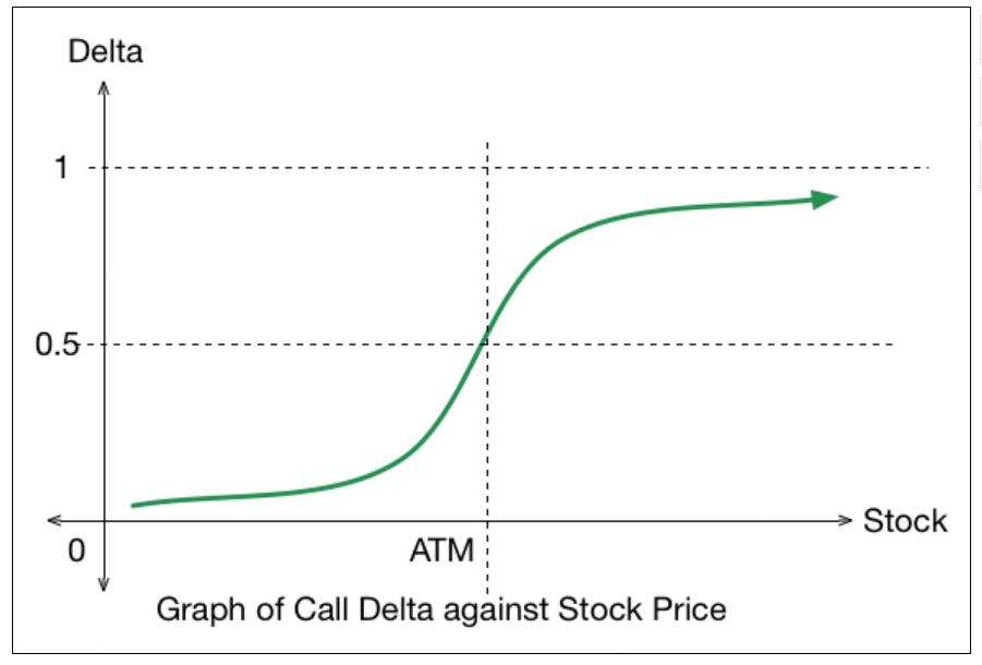 Note that the delta of the at-the-money call is just slightly over 0.5 while an at-the money put will be slightly less than 0.5.
