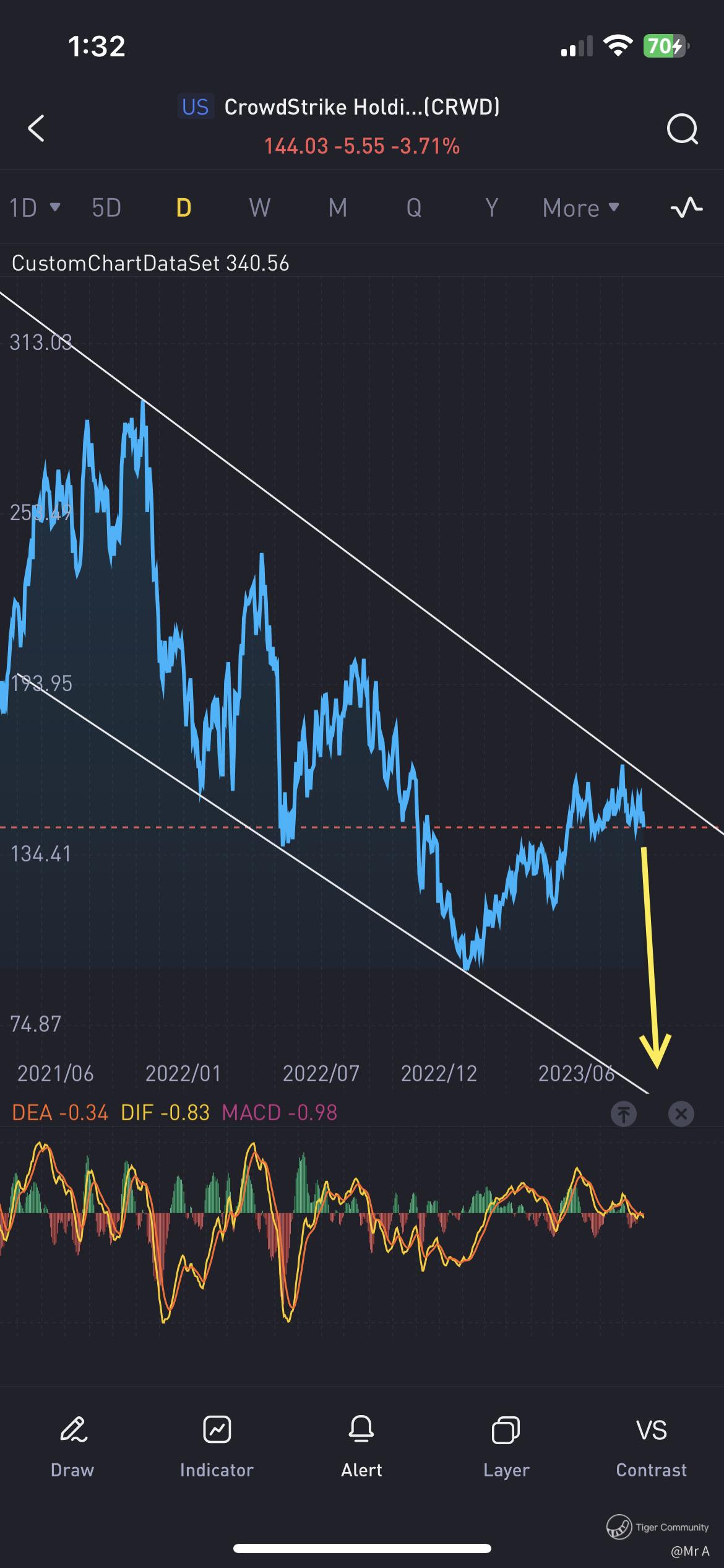 $CrowdStrike Holdings, Inc.(CRWD)$ look at the chart , it may start moving lower to hit the lower channel. Unless price is able to break out of the upper channel, then we can see it Chionh higher. What does you guys think?