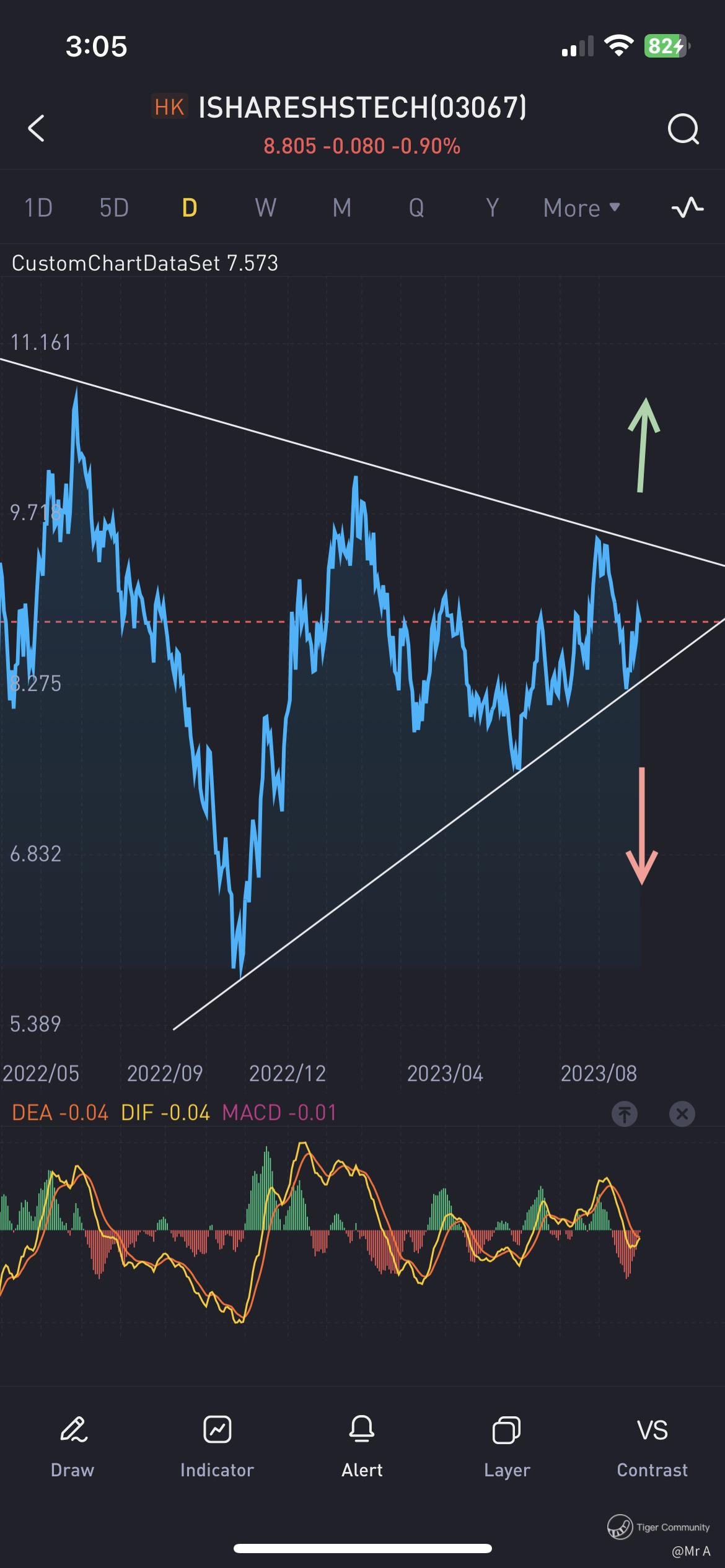 $ISHARESHSTECH(03067)$ time to decide for the breakout. Looking At the MACD bullish crossover below, nearing to observe some buy strength. What does you guys think?