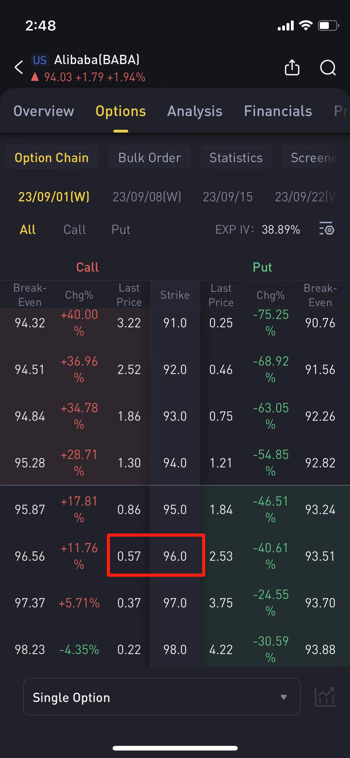 Let's consider an example: Currently, Alibaba's stock price is around $94. Suppose you hold this stock and anticipate a slight increase in its price to around $96 in the future. If you were to employ the Covered Call Option Strategy, you would first hold Alibaba's stock at a cost of $94. Subsequently, you would sell a call option with a strike price of $96 or even higher.