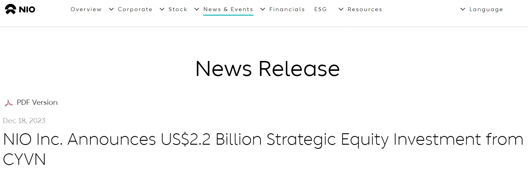 NIO Inc. (NYSE: $NIO Inc.(NIO)$ ; HKEX: $NIO-SW(09866)$ ; SGX: $NIO Inc.(NIO.SI)$ ) (“NIO” or the “Company”), a pioneer and a leading company in the premium smart electric vehicle market, today announced that it has entered into a share subscription agreement with CYVN Holdings L.L.C (“CYVN Holdings”), through its affiliate CYVN Investments RSC Ltd (the “Investor” or “CYVN”), an investment vehicle based in Abu Dhabi, pursuant to which CYVN will invest an aggregate of US$2.2 billion in cash to subscribe for 294,000,000 newly issued Class A ordinary shares of the Company at a per share purchase price of US$7.50 (the “December Investment Transaction”).